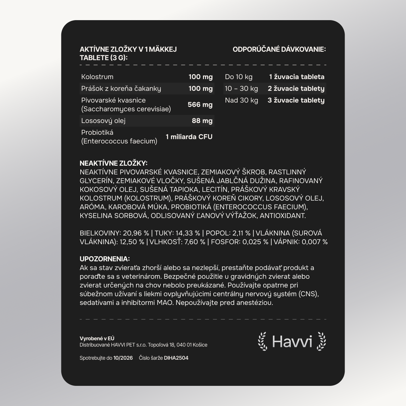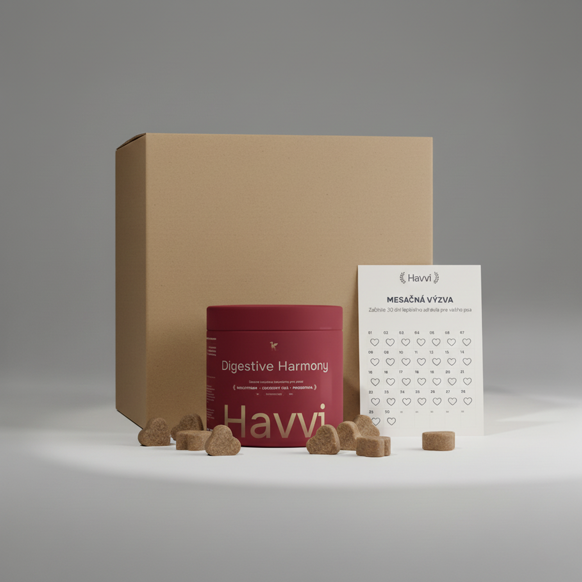 Bežné mäkké pamlsky bývajú postavené na škrobových bázach a dlhých zoznamoch „neaktívnych“ zložiek – gumy, oleje, sladidlá, arómy a farbivá. Výsledok: tvar a chuť, nie kvalita. Havvi používa krátke, zmysluplné zloženia bez plnidiel a bez syntetických farbív či príchutí. Pre každodenné podávanie a čisté zloženie, ktoré si viete prečítať
